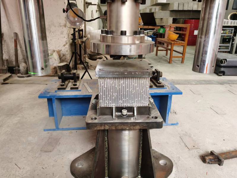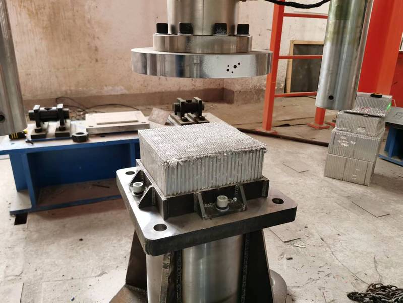 为研究铝蜂窝吸能块在10m/s和5m/s的高速冲击下材料的溃缩吸能性能,使用超高重型落锤试验机进行5.1m和1.3m的落锤冲击试验。全部冲击试验过程约0.02s,采用10000fps高速摄影机进行图像采集,同时进行力传感器,位移传感器的冲击数据采集,分析两种蜂窝状结构的吸能溃缩性能。两种蜂窝状吸能块可在受冲击面形成局部溃缩,消耗冲击能量,是一种较为理想的冲击材料。