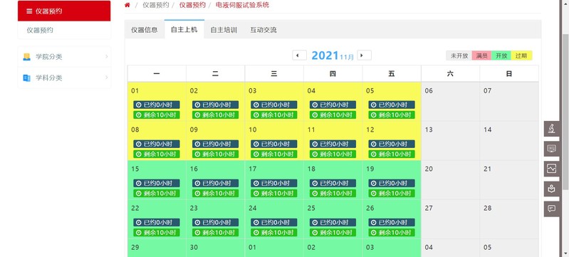 (2)申请人依次操作:【仪器预约】→【学院分类(土木学院)】→【选择仪器,自主上机】→【预约时间】
