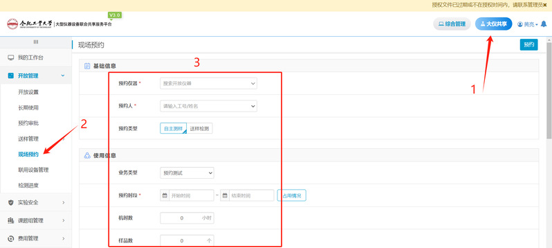 (2)设备管理员依次操作:【大仪共享】→【开放管理】→【现场预约】