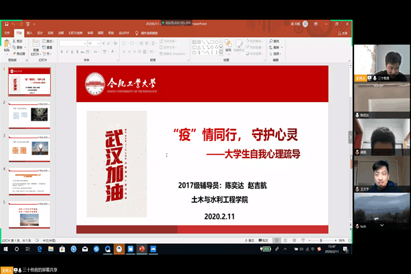 开展心理疏导微课堂,筑起疫情防控心防线。2月5日-11日,学院各年级辅导员老师积极关注学生面对突如其来的新型冠状病毒感染肺炎的疫情冲击下产生的担忧、害怕、焦虑、恐慌等应激反应和不良情绪,在学生中开展了以“‘疫’情同行,守护心灵”为主题的大学生心理疏导微课堂,全体同学参加了本次线上心理辅导活动。2017级辅导员陈奕达老师利用信息化设备进行了网络直播,介绍了疫情引发的身心应激反应,引导同学们通过察觉当下、接纳变化、良好作息、调节情绪和认知、为所当为和寻求专业帮助等方式做好心理应对,为同学们撑起“心灵保护伞”。2016级辅导员汤莺老师通过腾讯会议平台,就学生因考研和就业产生的焦虑、担忧等情绪,运用心理学方法和技术,通过情绪疏导、情感支持及危机干预等方式,引导学生发现自身问题并解决问题。2018级少数民族学生辅导员米尔扎提江通过网络平台引导少数民族学生正确科学认知疫情,认真学习疫情防控和心理疏导相关知识,合理安排疫情防控期间的学习生活。2019级辅导员马贤峰老师结合疫情防控和学生上学期学习情况,引导学生对大学学习生活进行认真总结规划,养成阳光向上的平和心态,积极面对疫情和接下来的网络在线学习生活。