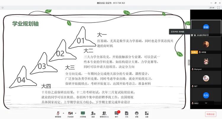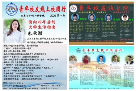 为进一步加强疫情防控期间学生思想政治教育和班风学风建设,丰富学院第二课堂活动体系,充分发挥榜样引领作用,教育引导青年学子向榜样看齐、向榜样学习,3月21日至28日,社团学姐漫画 以网为媒,发挥线上实时互动的优势,组织开展了青年校友线上校园行系列活动。活动邀请了现在同济大学、浙江大学、西安交通大学、大连理工大学、中南大学、湖南大学、英国格拉斯哥大学等攻读硕士研究生的青年校友面向2019级学生进行了线上分享交流。