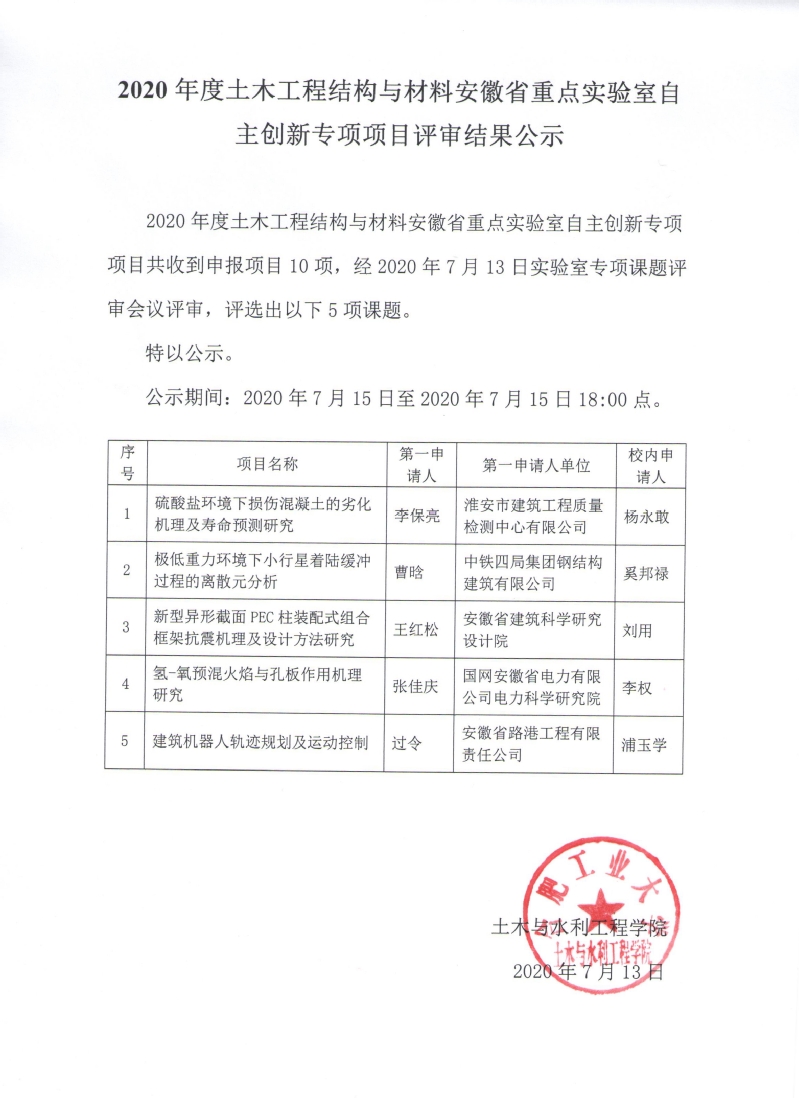 2020年度土木工程结构与材料安徽省重点实验室自主创新专项项目评审结果公示