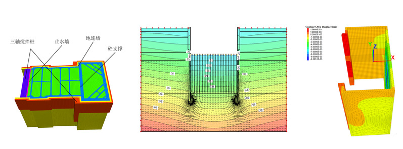 张振华教授、卢坤林副教授组建科研团队,结合现场实际情况,连夜开展科研工作,建立了复杂基坑数值模型,可模拟长江水位连续变化下复杂基坑渗流场和应力场特征,及时提供给芜湖市轨道(隧道)质量安全监督站和施工单位,为科学评估基坑汛期安全以及安全渡汛方案提供了技术支持,顺利保障了芜湖城南过江隧道项目端头井深基坑的汛期安全。