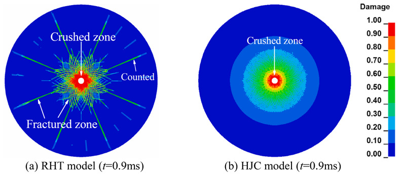 为了使两种本构模型具有可比性,本研究基于同一组花岗岩试样的试验数据,确定了两种本构的模型参数。在单次爆破模拟中,RHT模型能较好地描述炮孔附近粉碎区的形成和远端径向拉伸裂纹的扩展,并且其模拟结果与理论和试验结果吻合较好。而HJC模型的损伤云图仅能表征粉碎区的形成而无法描述径向裂纹的演化(图1)。为此,本工作对HJC模型进行了改进,引入了“最大拉应力+最大剪应变”的复合失效准则,使其能较好地模拟出单次爆破的裂纹扩展过程(图2)。