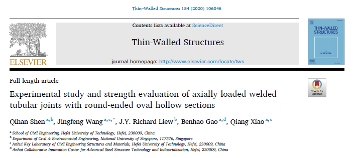 近日,王静峰教授课题组在新型管桁架节点性能研究方面取得了新进展,研究成果发表在国际期刊《Thin-Walled Structures》(JCR Q1,IF=4.033)上,论文题为“Experimental study and strength evaluation of axially-loaded welded tubular joints with round-ended elliptical hollow sections. Thin-Walled Structures, 2020, 154: 106846.”,青年教师沈奇罕为论文第一作者,王静峰教授为通讯作者,新加坡国立大学工程院院士Richard Liew教授为论文第二作者,该项工作得到教育部新世纪优秀人才支持计划项目资助。