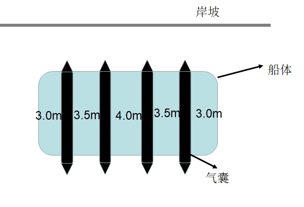 浮船在水库放空后,由于自身重力作用陷入岸坡的淤泥中。此时,在淤泥吸附力影响下,浮船单靠自身重力很难上浮。由于水库为重要的水源地,水库管理方不允许抛填材料进行岸坡处理,科研团队针对水库管理方要求和岸坡地质条件,分析了不同荷载下气囊的变形情况,设计了船底布置气囊的方案。在计算过程中,详细分析了浮船及气囊的受力情况,计算了水库放水和蓄水过程中浮船状态变化情况。