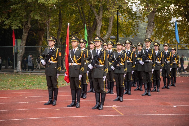 最后,从队伍中走出四名同学,齐声朗诵《谁是最可爱的人》,队伍旁三十余名新生排列出“71”字样的队形,呼应本次纪念中国人民志愿军抗美援朝出国作战71周年主题,整齐划一的队形,慷慨激昂的声音,饱含深情的朗诵,使全场气氛达到高潮。