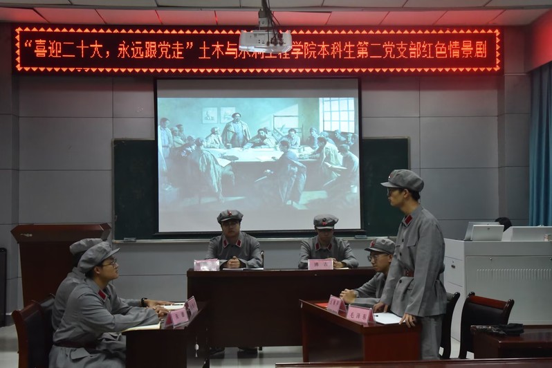 “砼”心演绎,青春向党。10月3日,学院本科生第二党支部在纬地楼515室以“喜迎二十大,永远跟党走”为主题开展了“遵义会议”红色情景剧展演活动。演出最后,全体师生挥舞国旗,齐声合唱《我和我的祖国》,向祖国母亲致以崇高的敬意和真挚的祝福。