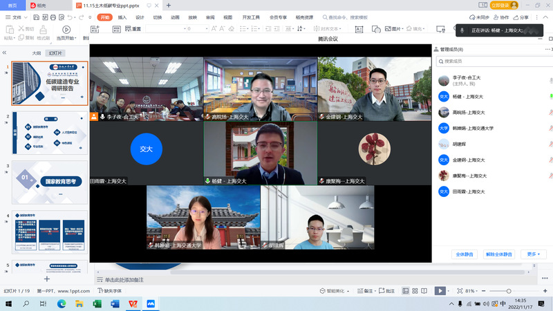 11月17日下午,社团学姐漫画 与上海交通大学船舶海洋与建筑工程学院通过线上方式举办了低碳专业交流研讨会。上海交通大学船舶海洋与建筑工程学院副院长杨健、院长助理金建钢、土木系副主任高皖扬、学院本科教学办及相关专业负责人,社团学姐漫画 院长王静峰、建筑工程系主任郅伦海、建筑环境与能源应用工程系主任何伟、市政工程系副主任冯景伟、建筑工程系副主任王波、学院教学办和相关负责人参加了研讨会。