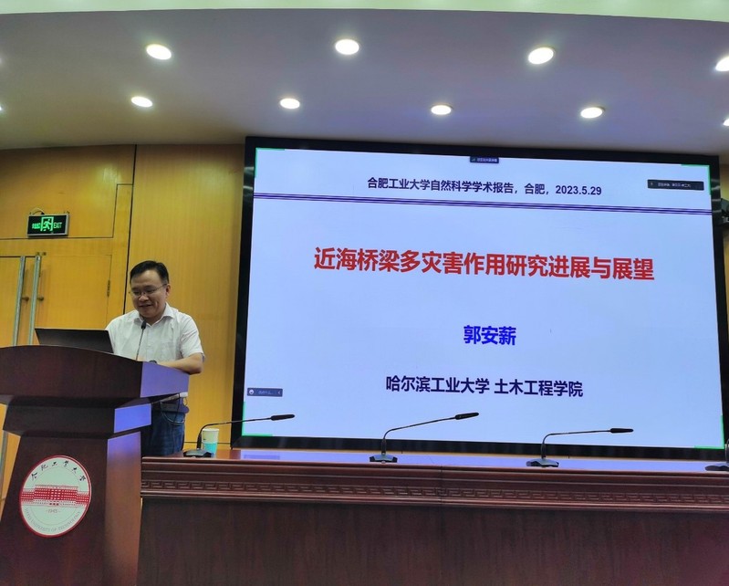 5月29日,郭安薪教授在社团学姐漫画 屯溪路校区学术会议中心做了学术报告《近海桥梁多灾害作用研究进展及展望》。王静峰院长对郭安薪教授来访指导学科建设并作学术报告表示热烈欢迎,详细介绍了他的学术成就及研究成果,强调了多灾害复杂作用对土木工程结构安全产生巨大挑战,其防灾减灾理论和新技术应用具有的重要科学和工程意义。