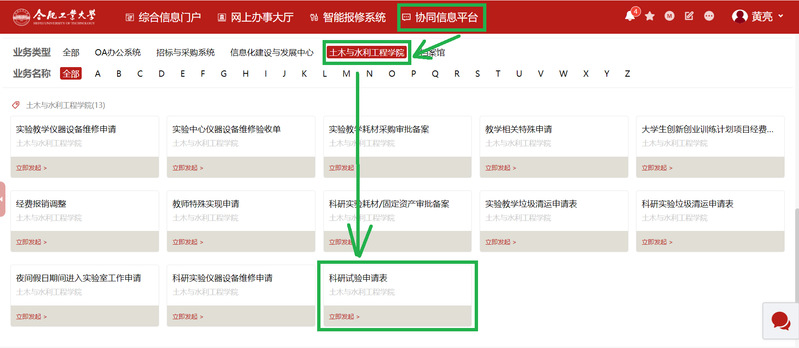 (1)试验申请人(本科、研究生)打开 【信息门户】→【协同信息平台】→【社团学姐漫画 】→【科研实验申请表】,填写试验申请。