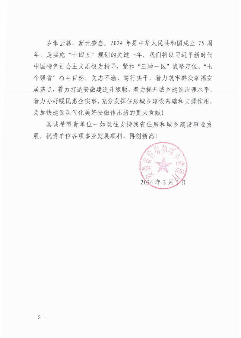 喜讯,安徽省住房和城乡建设厅发来感谢信!