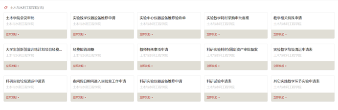 同时,学院实验中心也利用办公系统解决了办公信息碎片化的难题。传统纸质化办公存在试验项目分散、信息汇总困难、试验统筹安排混乱等问题,在新系统的帮助下,实验中心已实现试验项目全流程管理,助力实验中心在试验前对项目进行方案审核、在试验中有针对性的进行安全监管、在试验后对接实验室设备和场地收费、垃圾清运等工作,极大的提高了实验室工作效率,助力实验室安全运行。信息化建设与发展中心积极服务学院一线需求,获得学院师生的一致好评。