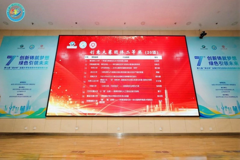 第七届深水杯全国大学生给排水科技创新大赛由中国城镇供水排水协会科学技术委员会、全国大学生给排水科技创新大赛组委会指导,深圳市环境水务集团有限公司承办。经过各高校激烈的作品初赛选拨,最终汇聚了来自全国各地86所高校的181支队伍,其中包括127支参与创意赛和54支参与定向专题竞赛的队伍。此次比赛中,郑梦启老师指导的项目菌藻之交,‘泥’转乾坤酚氨废水处理及资源化的菌-藻微生物燃料电池荣获二等奖,距离一等奖仅0.08分微弱差距。