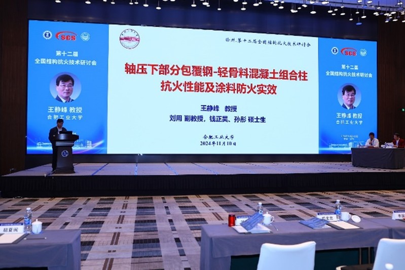 会议期间,王静峰教授做了大会报告“轴压下部分包覆钢-轻骨料混凝土组合柱抗火性能及涂料防火实效”,刘用副教授做分组报告“异形截面部分包覆钢-混凝土组合柱抗火性能研究”,黄俊旗副教授做分组报告“预制地聚物混凝土夹心墙板单面受火性能研究”,会议上与国内学者专家进行了充分交流、碰撞思想和合作研讨。