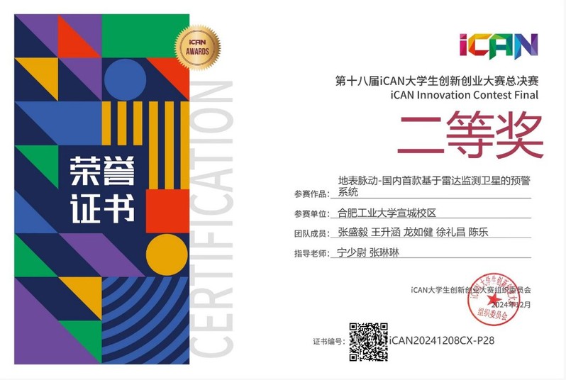 在第十八届ICAN大学生创新创业大赛总决赛上,团队再度彰显实力,斩获国家级二等奖。他们的参赛项目围绕城市韧性建设展开,通过多学科交叉与技术融合,综合运用高精度卫星遥感、地理信息系统(GIS)、地表点云数据处理与仿真分析等先进技术手段,为城市地表形变与结构安全提供精准的监测和预警,为城市可持续发展与现代化治理提供数据支撑与决策参考。