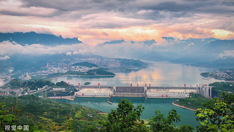 三峡水库在防洪方面发挥了重要作用,自蓄水以来累计拦洪总量超过1800亿立方米,极大减轻了长江中下游地区的防洪压力。三峡电站为华东、华中、广东等地区提供了重要的电力支持,成为我国重要的大型清洁能源生产基地。三峡工程显著改善了川江航道通航条件,自2003年试通航以来,过闸货运量快速增长,有力推动了长江经济带发展。三峡水库每年枯水季节下泄流量提高到5500立方米每秒以上,为长江中下游补水200多亿立方米,改善了中下游地区的生产、生活和生态用水条件。三峡电站发出的优质清洁电力相当于节约标准煤4.30亿吨,减少二氧化碳排放11.69亿吨,节能减排效益显著。移民工程共搬迁安置城乡移民131.03万人,移民生产生活状况显著改善,库区基础设施、公共服务设施实现跨越式发展。三峡工程与周围的自然景观融为一体,形成了高峡出平湖的壮丽景观。泄流建筑物形成的人工瀑布具有很高的观赏价值。综上所述,三峡工程的整体格局体现了其在防洪、发电、航运、水资源利用等方面的巨大综合效益,同时也展现了其作为一项重大工程的宏伟规模和深远影响。