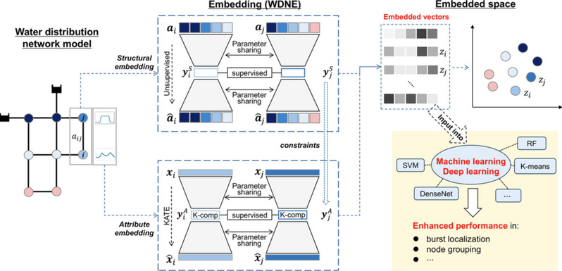 针对供水管网(WDN)中水力特征难以被机器学习方法有效利用的问题,开发了一种创新的供水管网嵌入(WDNE)模型。该模型结合深度自编码器技术(SDNE)进行管网结构特征的嵌入,并使用K-竞争自编码器(KATE)实现管网节点静态和动态特征(属性)的嵌入,成功将管网水力关系和节点特征转换为更加适合机器学习处理的向量形式。这使得下游任务中的机器学习方法能够充分理解和利用WDN数据中蕴含的复杂水力特征,从而减少对大量训练数据的需求。该模型使得机器学习方法更加轻量化,并拓宽了WDN中机器学习方法可应用的范围。研究表明,WDNE模型在供水管网爆管定位和节点分组任务中均有效提升了机器学习方法的性能。作为促进复杂WDN数据与机器学习方法高效融合的桥梁,该模型有望在更加广泛的水系统中发挥重要作用。