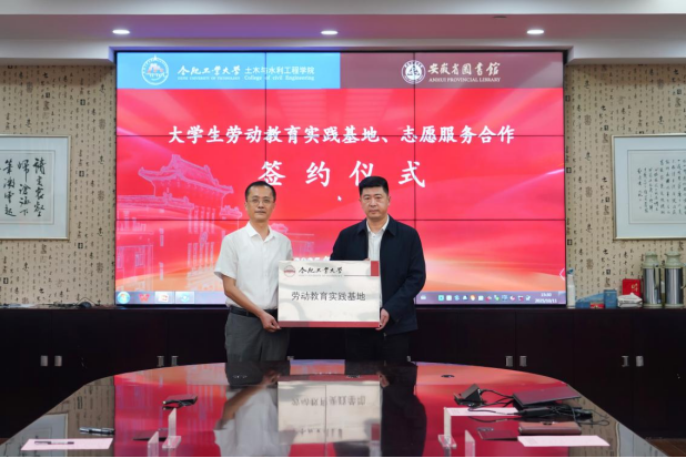 随后,学院党委副书记、纪委书记关茜与安徽省图书馆党委委员、副馆长董松代表双方签订志愿服务协议以及劳动教育实践基地协议,王东坡与左金刚为劳动教育实践基地揭牌。