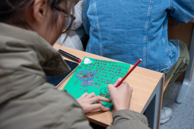 活动现场洋溢着热烈而专注的氛围。同学们手持彩笔与卡纸,倾心创作:有人以细腻笔触描绘生动插画,将祝福蕴于斑斓色彩之中;有人伏案书写诗句,以凝练文字编织温暖梦境;还有人真诚分享成长感悟,以亲身经历传递前行力量。一张张贺卡虽篇幅有限,却承载着学子们深厚的善意与牵挂。每件作品皆为独特的心灵艺术品,字里行间凝结着真诚的关怀与期许。