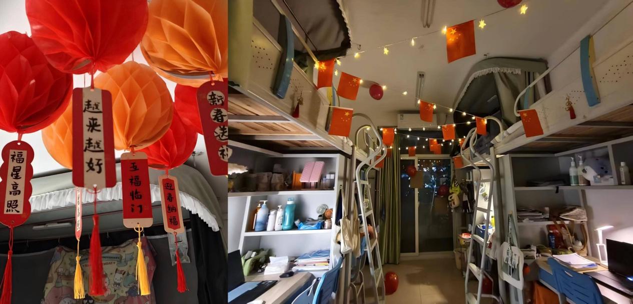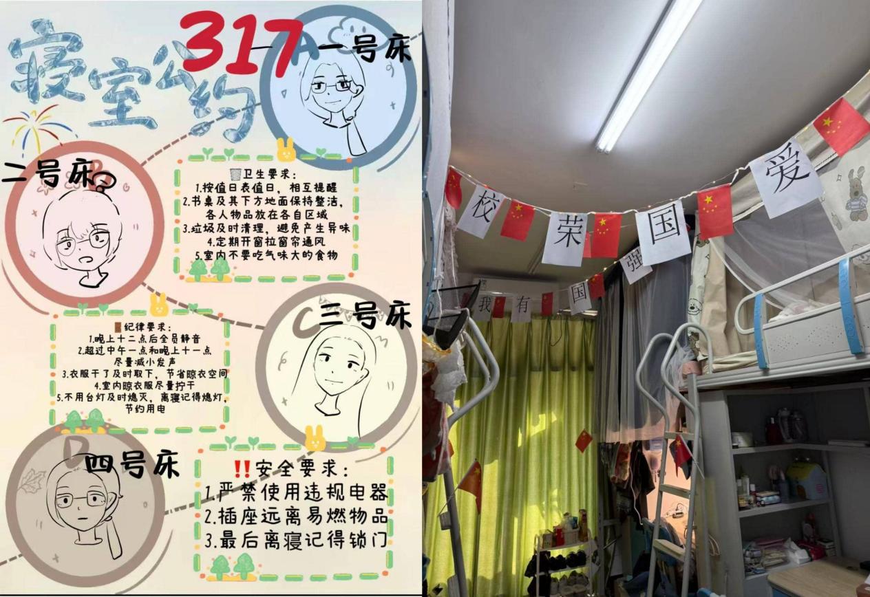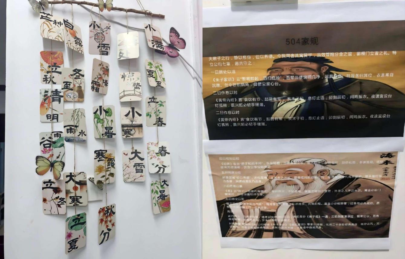 答辩现场,各寝室围绕“爱国荣校”“传统文化”等主题,生动诠释了对母校的深情与对集体的热爱。例如,3号北楼317寝室以“爱国荣校”为核心,用国旗与励志标语串联起整个空间,让寝室成为承载家国情怀的日常居所;3号北楼316寝室则以中国红为主色调,融爱国元素于设计之中,借红色的热烈传递爱国之情,以温馨的迎新布置展现青春朝气,营造出爱国、温暖、向上的生活氛围。此外,各寝室还涌现出诸多富有创意的文化布景:二十四节气主题墙让单调的墙面焕发生机,在无声中传递传统文化魅力;文言文写就的“寝室家规”为公约增添文韵,更以“家规”二字凝聚归属感,让温情浸润每一处细节。